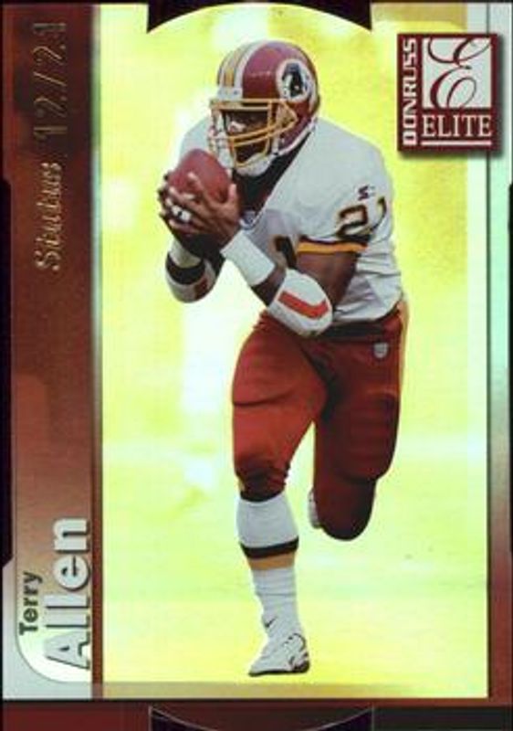 The Terry Allen 1999 Donruss Elite #002 Status /28 card is 1 of 3 Terry Allen's card variations in the 1999 Donruss Elite set being tracked by Sports Card Investor, including Base, and Aspirations /72.