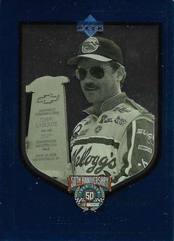 The Terry Labonte 1998 Upper Deck Road to the Cup #AN44 50th Anniversary card is 1 of 12 Terry Labonte's card variations in the 1998 Upper Deck Road to the Cup set being tracked by Sports Card Investor, including #5 Base, #69 Base, #97 Base, #AN45 50th Anniversary, and #CS2 Cover Story.