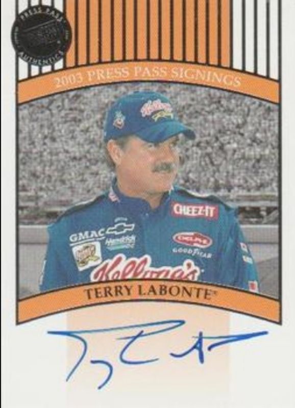 The Terry Labonte 2003 Press Pass Premium Signings card is 1 of 12 Terry Labonte's card variations in the 2003 Press Pass Premium set being tracked by Sports Card Investor, including #16 Base, #51 Base, #16 Beckett Samples, #P16 Red Reflectors, and #P51 Red Reflectors.