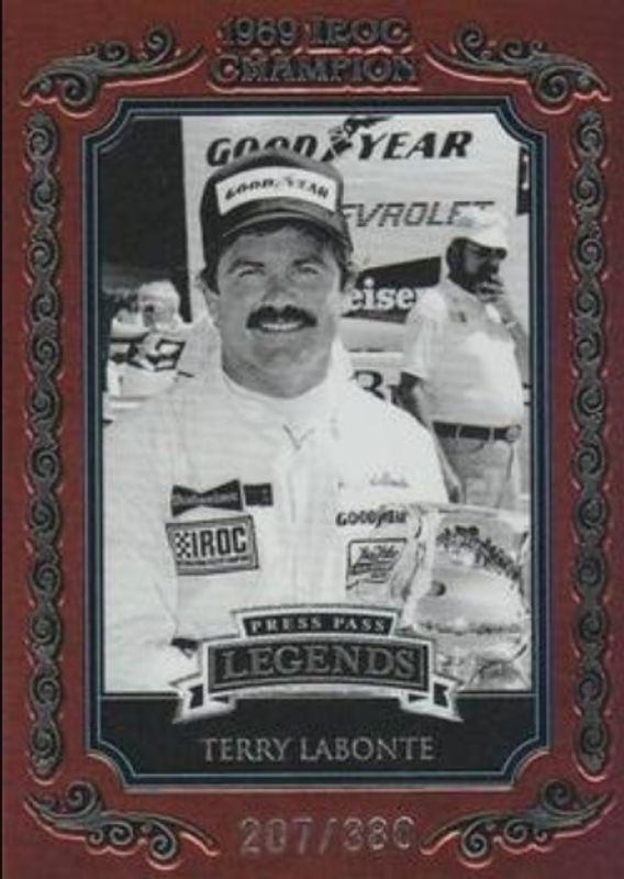 The Terry Labonte 2008 Press Pass Legends #IC-11 IROC Champions /3801974 card is 1 of 29 Terry Labonte's card variations in the 2008 Press Pass Legends set being tracked by Sports Card Investor, including Base, Blue /599, Bronze /299, Gold /99, and Holo /25.