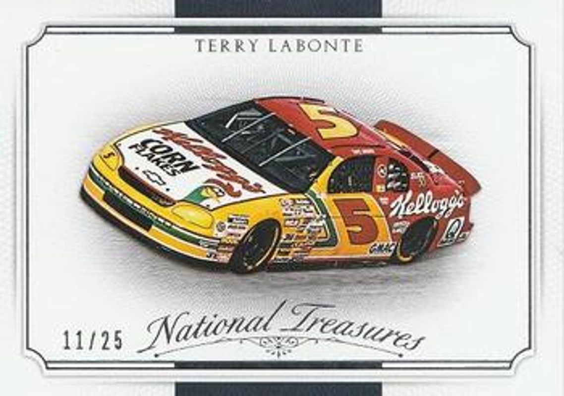 The Terry Labonte 2016 National Treasures NASCAR #35 Base /25 card is 1 of 27 Terry Labonte's card variations in the 2016 National Treasures NASCAR set being tracked by Sports Card Investor, including #41 Base /25, #35 Century Silver /20, #41 Century Silver /20, #41 Century Gold /15, and #35 Century Gold /15.