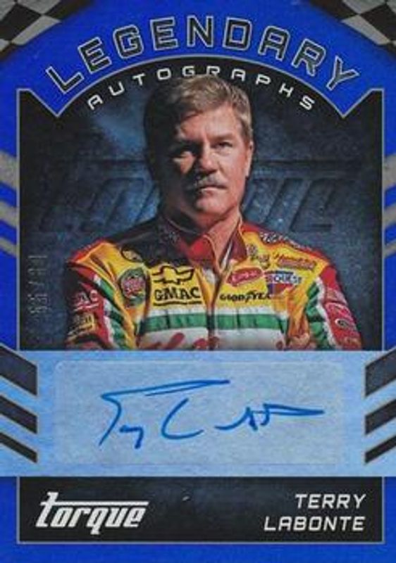 The Terry Labonte 2016 Torque NASCAR #LA-TL Legendary Autographs Blue /75 card is 1 of 46 Terry Labonte's card variations in the 2016 Torque NASCAR set being tracked by Sports Card Investor, including Base, Gold, Blue /125, Red /99, and Artist Proof /50.