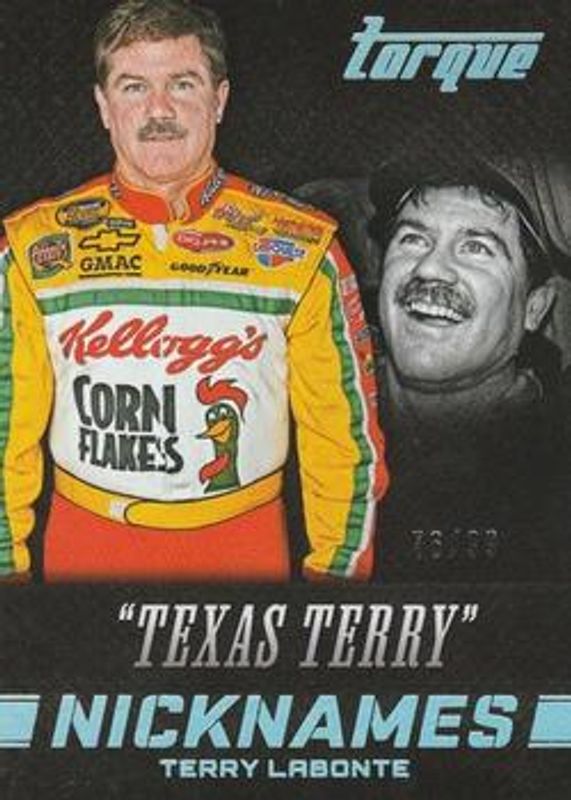The Terry Labonte 2016 Torque NASCAR #N10 Nicknames Holo Silver /99 card is 1 of 46 Terry Labonte's card variations in the 2016 Torque NASCAR set being tracked by Sports Card Investor, including Base, Gold, Blue /125, Red /99, and Artist Proof /50.