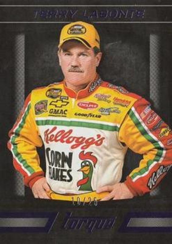 The Terry Labonte 2016 Torque NASCAR #100 Purple /25 card is 1 of 46 Terry Labonte's card variations in the 2016 Torque NASCAR set being tracked by Sports Card Investor, including Base, Gold, Blue /125, Red /99, and Artist Proof /50.