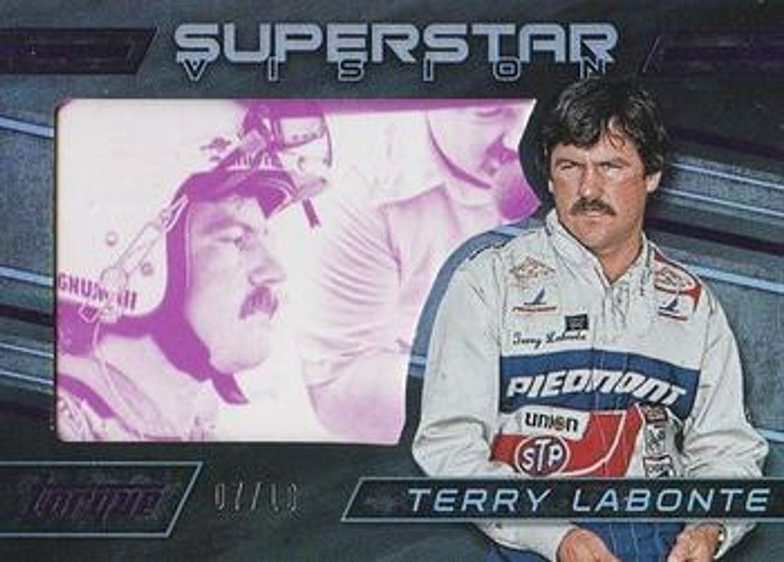 The Terry Labonte 2016 Torque NASCAR #SV17 Superstar Vision Purple /10 card is 1 of 46 Terry Labonte's card variations in the 2016 Torque NASCAR set being tracked by Sports Card Investor, including Base, Gold, Blue /125, Red /99, and Artist Proof /50.