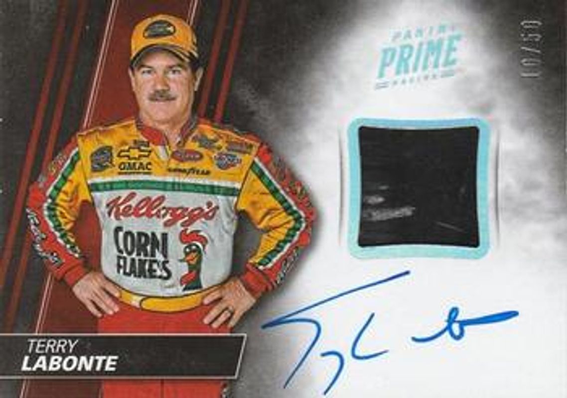 The Terry Labonte 2018 Prime NASCAR #AM-TL Autographs Materials /25 card is 1 of 22 Terry Labonte's card variations in the 2018 Prime NASCAR set being tracked by Sports Card Investor, including #95 Base /50, #29 Base /50, #62 Base /50, #95 Holo Gold /25, and #29 Holo Gold /25.