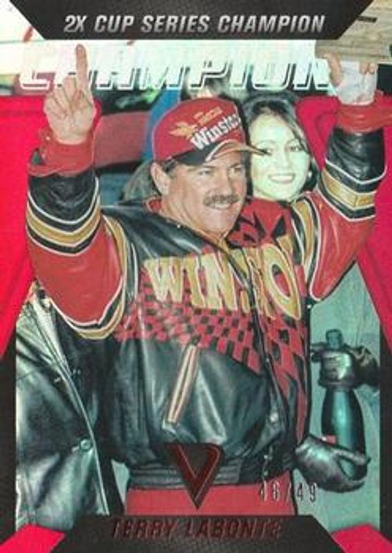 The Terry Labonte 2018 Victory Lane NASCAR #C7 Champions Red /49 card is 1 of 38 Terry Labonte's card variations in the 2018 Victory Lane NASCAR set being tracked by Sports Card Investor, including Base, Silver, Gold /99, Red /49, and Blue /25.