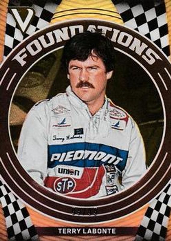 The Terry Labonte 2018 Victory Lane NASCAR #F9 Foundations Gold /99 card is 1 of 38 Terry Labonte's card variations in the 2018 Victory Lane NASCAR set being tracked by Sports Card Investor, including Base, Silver, Gold /99, Red /49, and Blue /25.