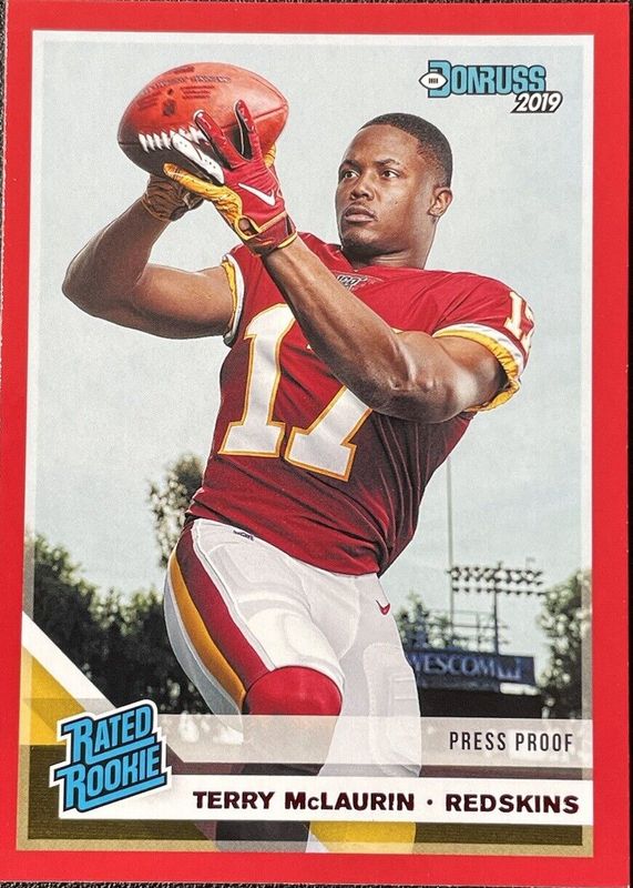 The Terry McLaurin 2019 Donruss #329 Press Proof Red Rookie card in Raw condition has moved down -$9.00 (-90.1%) in the last 30 days and was last sold for $0.99 .