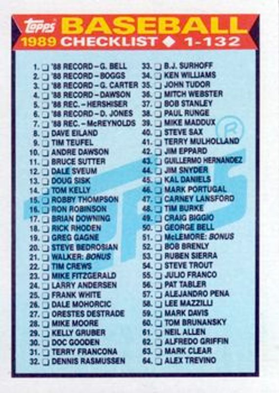 Other popular players in the 1989 Topps set include Checklist, Gary Sheffield, Orel Hershiser, Don Mattingly, and Gary Carter.