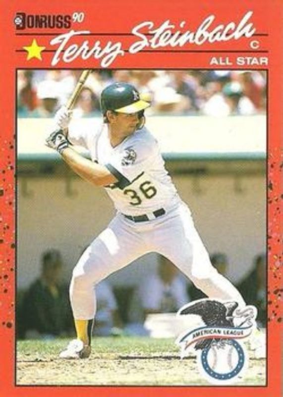 The Terry Steinbach 1990 Donruss #637 Base card is 1 of 2 Terry Steinbach's card variations in the 1990 Donruss set being tracked by Sports Card Investor, including Base.