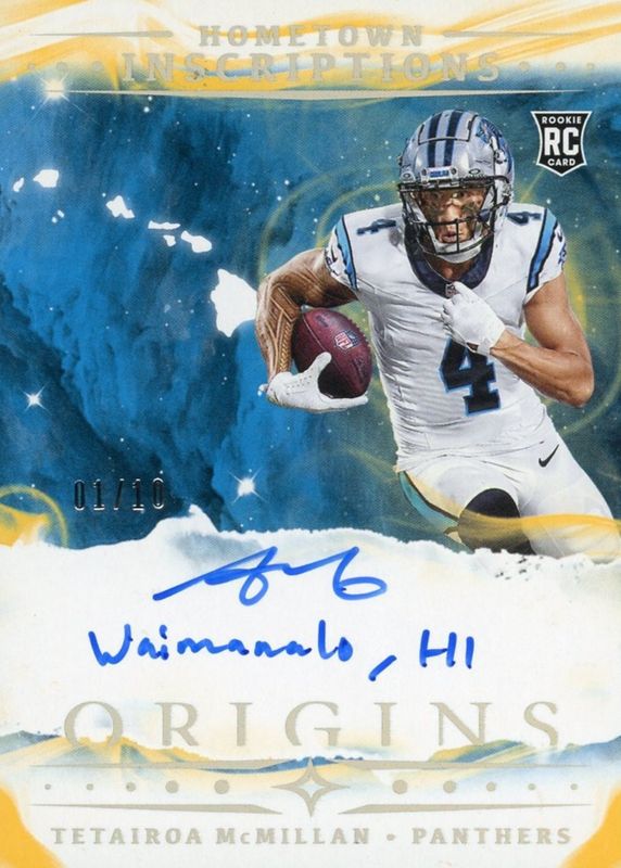 The Tetairoa McMillan 2025 Origins #HI-5 Hometown Inscriptions - Gold /10 Rookie card in Raw condition has not changed in price in the last 30 days and was last sold for $424.00 .