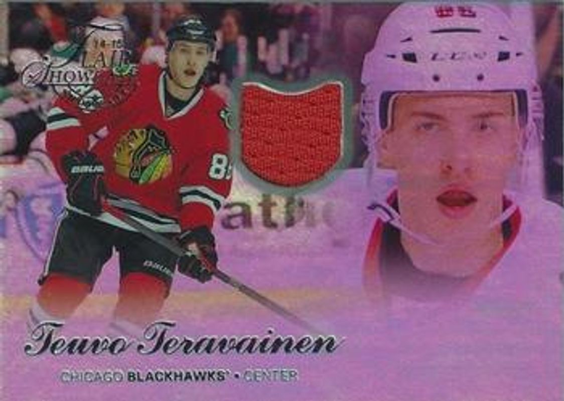 The Teuvo Teravainen 2014 Fleer Showcase #53 Flair Showcase Jerseys Rookie card is 1 of 18 Teuvo Teravainen's card variations in the 2014 Fleer Showcase set being tracked by Sports Card Investor, including Base /399, Precious Metal Gems Blue /100, Red Glow /27, White Hot /9, and '14 Ultra Autographs Buyback COAs.