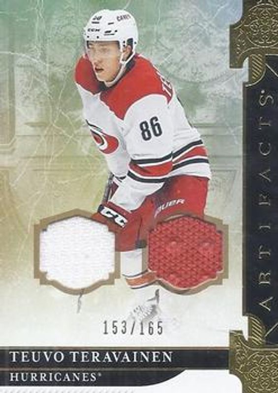 The Teuvo Teravainen 2019 Upper Deck Artifacts #54 Materials - Gold /125 card is 1 of 13 Teuvo Teravainen's card variations in the 2019 Upper Deck Artifacts set being tracked by Sports Card Investor, including Base /999, Copper /299, Emerald /99, Pink /85, and Aqua /45.