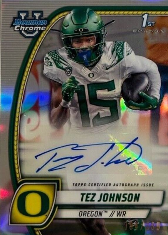 This card is 1 of 14 Tez Johnson's card variations in the 2024 Bowman Chrome University set being tracked by Sports Card Investor, including Prospect Auto (1st), Prospect Auto - Stealth Refractor (1st), Prospect Auto - Fuchsia Refractor /150 (1st), Prospect Auto - Green Refractor /99 (1st), and Prospect Auto - Yellow Refractor /75 (1st).