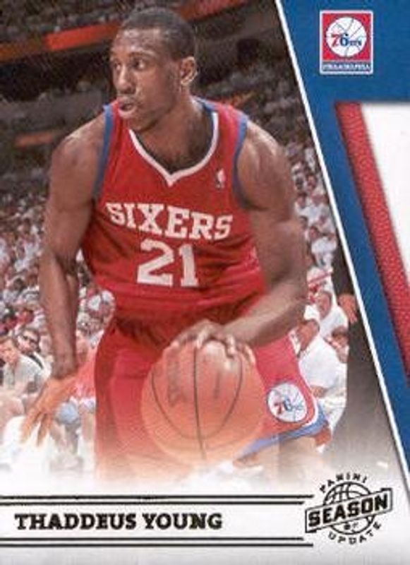 The Thaddeus Young 2010 Season Update #26 Base card is 1 of 4 Thaddeus Young's card variations in the 2010 Season Update set being tracked by Sports Card Investor, including Silver /99, Gold /24, and Platinum /1.