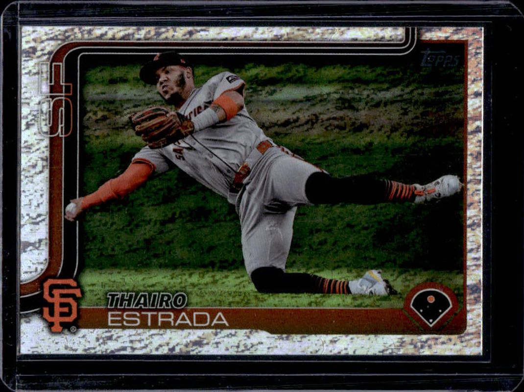 The Thairo Estrada 2025 Topps #2 Holo Foil card is 1 of 75 Thairo Estrada's card variations in the 2025 Topps set being tracked by Sports Card Investor, including Base, Aqua Holo Foil, Diamante Foil, Pink Diamante Foil, and Pink Holo Foil.