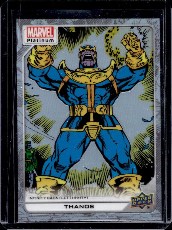 Thanos' Marvel cards are available in at least 20 sets. Thanos' biggest 7-day price movers are 1990 Impel Marvel Universe #79 Base, 2023 Upper Deck Marvel Platinum #141 Rainbow, and 2023 Upper Deck Marvel Platinum #141 Printing Plates Cyan /1.