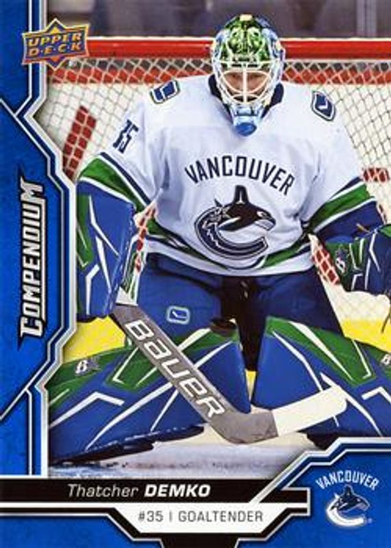 Thatcher Demko's Hockey cards are available in at least 54 sets. Thatcher Demko's biggest 7-day price movers are 2018 Upper Deck Compendium #766 Blue, 2021 Upper Deck Allure #BB-20 Breadbaskets - Golden Treasures /1, and 2021 Upper Deck Allure #BB-20 Breadbaskets.