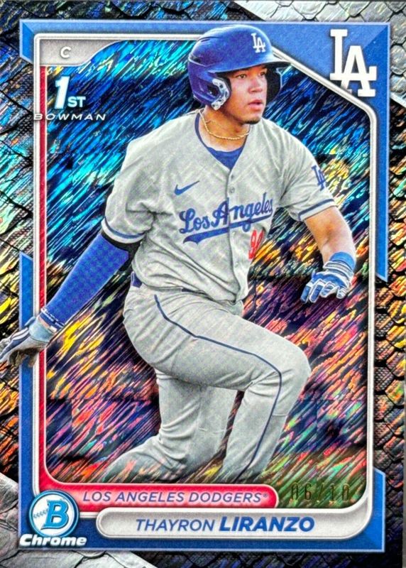 This card is 1 of 51 Thayron Liranzo's card variations in the 2024 Bowman Chrome set being tracked by Sports Card Investor, including Prospects (1st), Prospects - Shimmer Refractor (1st), Prospects - Refractor /499 (1st), Prospects - Speckle Refractor /299 (1st), and Prospects - Purple Refractor /250 (1st).