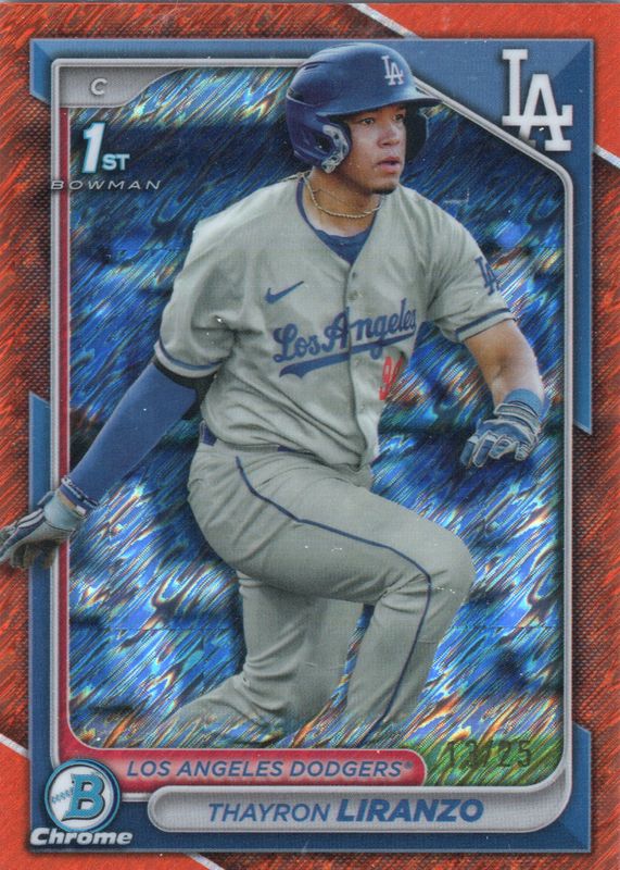 This card is 1 of 51 Thayron Liranzo's card variations in the 2024 Bowman Chrome set being tracked by Sports Card Investor, including Prospects (1st), Prospects - Shimmer Refractor (1st), Prospects - Refractor /499 (1st), Prospects - Speckle Refractor /299 (1st), and Prospects - Purple Refractor /250 (1st).