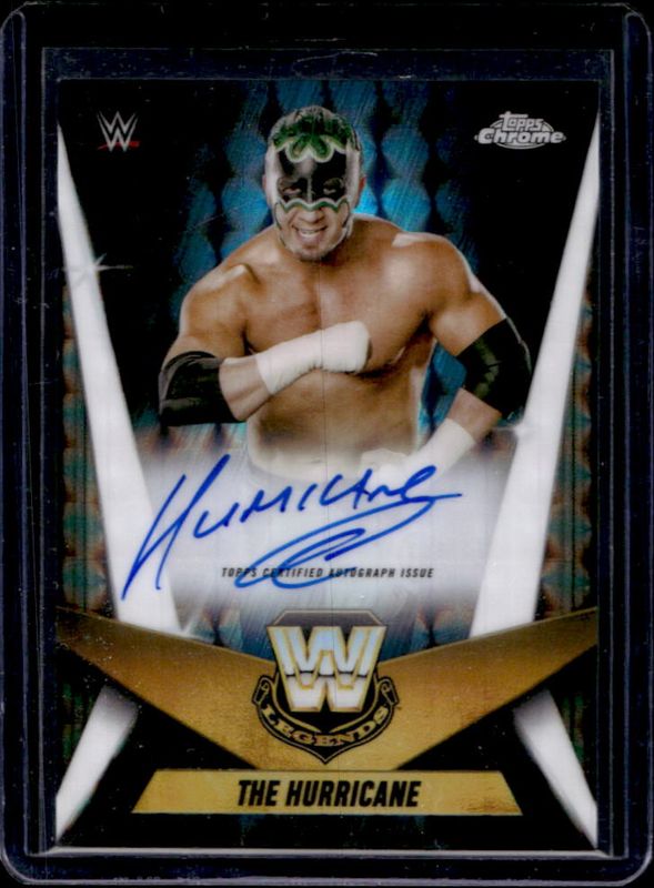 The The Hurricane 2025 Topps Chrome WWE #LCA-TH Legendary Chrome Autographs - Geometric Refractor card is 1 of 14 The Hurricane's card variations in the 2025 Topps Chrome WWE set being tracked by Sports Card Investor, including Legendary Chrome Autographs, Legendary Chrome Autographs - Refractor /175, Legendary Chrome Autographs - Blue Refractor /150, Legendary Chrome Autographs - Gold Geometric Refractor /50, and Legendary Chrome Autographs - Gold Refractor /50.