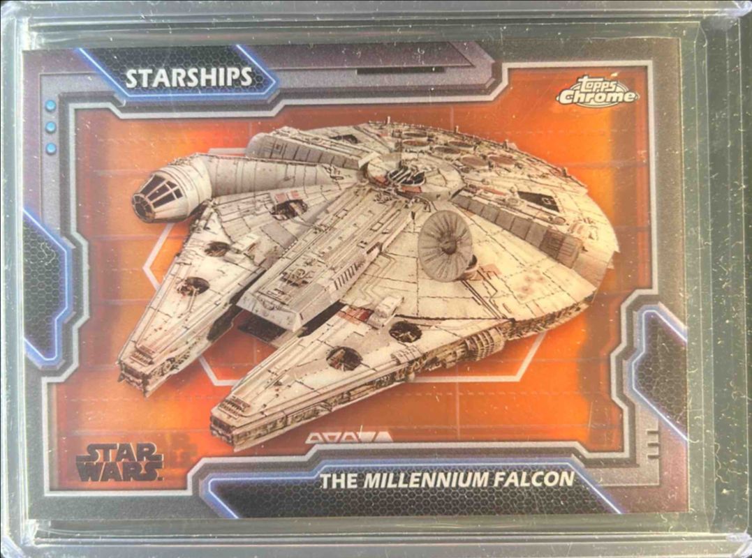The The Millennium Falcon 2024 Topps Chrome Star Wars #S-1 Starships - Rebel Orange Refractor /25 card is 1 of 6 The Millennium Falcon's card variations in the 2024 Topps Chrome Star Wars set being tracked by Sports Card Investor, including Starships, Starships - Gold Refractor /50, Starships - Mustafar Lava Refractor /10, Starships - Dathomir Red Refractor /5, and Starships - Superfractor /1.