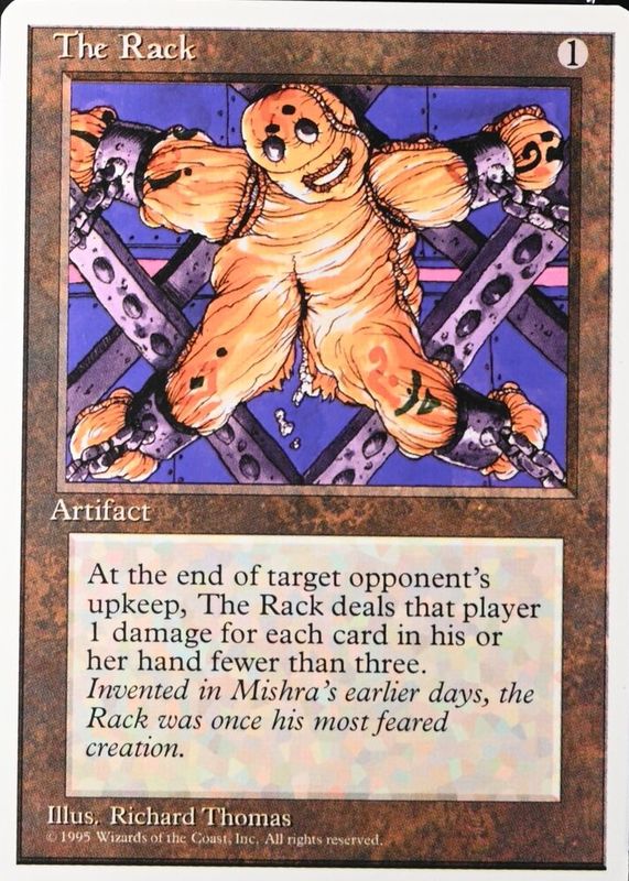 The The Rack 1995 Fourth Edition Base card in Raw TCG (Near Mint) condition has moved down -$0.01 (-0.5%) in the last 30 days and was last sold for $1.99 .