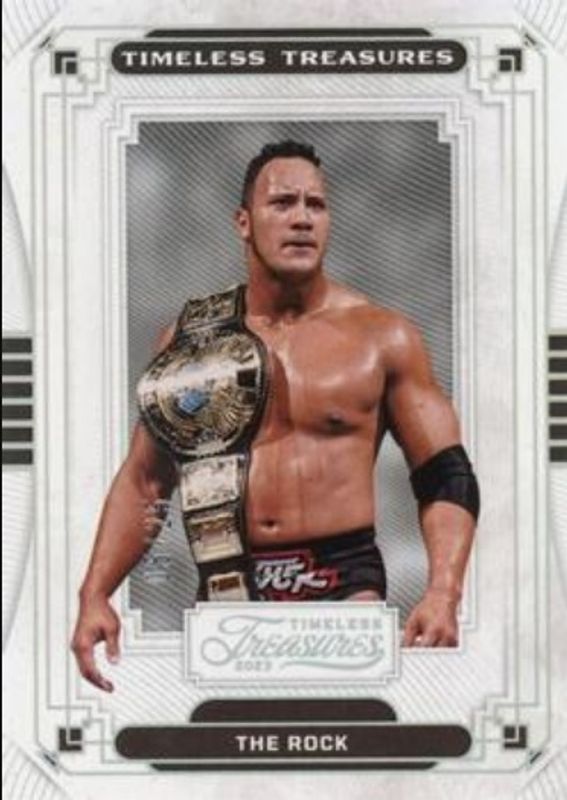 The The Rock 2023 Chronicles WWE #TT-25 Timeless Treasures - Holo Silver /25 card is 1 of 28 The Rock's card variations in the 2023 Chronicles WWE set being tracked by Sports Card Investor, including #117 Base, #333 Base, #117 Bronze, #333 Silver, and #333 Silver Wave.
