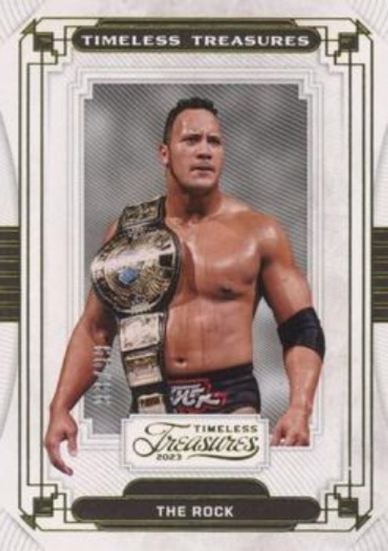 The The Rock 2023 Chronicles WWE #TT-25 Timeless Treasures /99 card is 1 of 28 The Rock's card variations in the 2023 Chronicles WWE set being tracked by Sports Card Investor, including #117 Base, #333 Base, #117 Bronze, #333 Silver, and #333 Silver Wave.