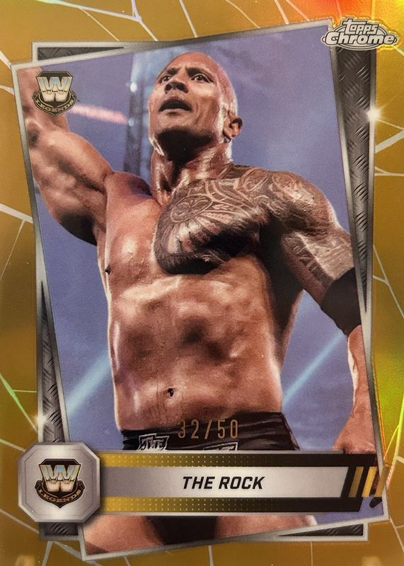 The The Rock 2025 Topps Chrome WWE #10 Gold Refractor /50 card in Raw condition has not changed in price in the last 30 days and was last sold for $96.55 .