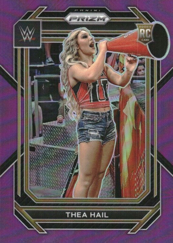 The Thea Hail 2023 Prizm WWE #122 Purple /149 Rookie card in Raw condition has not changed in price in the last 30 days and was last sold for $1.25 .