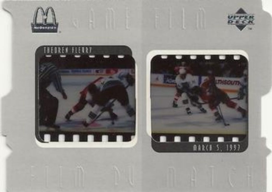 The Theo Fleury 1997 Upper Deck Ice McDonald's #F9 Game Film card is 1 of 2 Theo Fleury's card variations in the 1997 Upper Deck Ice McDonald's set being tracked by Sports Card Investor, including Base.