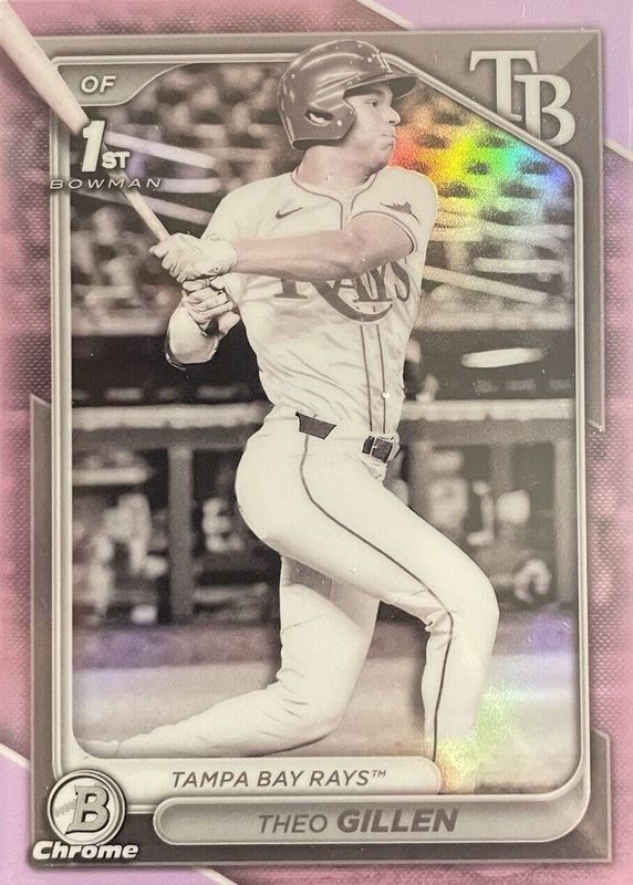 The Theo Gillen 2024 Bowman Draft #BDC-73 Chrome - Pearl Refractor (1st) card in Raw condition has not changed in price in the last 30 days and was last sold for $50.99 .
