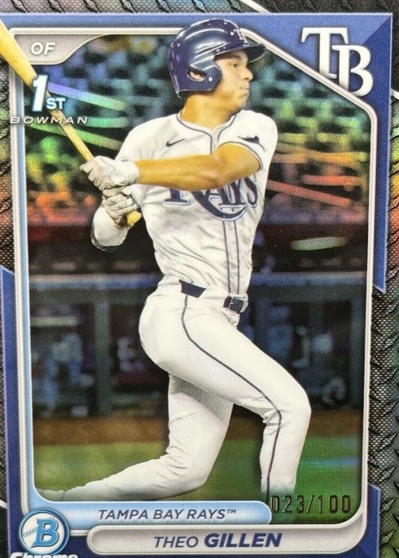 This card is 1 of 50 Theo Gillen's card variations in the 2024 Bowman Draft set being tracked by Sports Card Investor, including Chrome (1st), Chrome - Bubble Gum (1st), Chrome - Lunar Glow Refractor (1st), Chrome - Peanuts (1st), and Chrome - Pearl Refractor (1st).