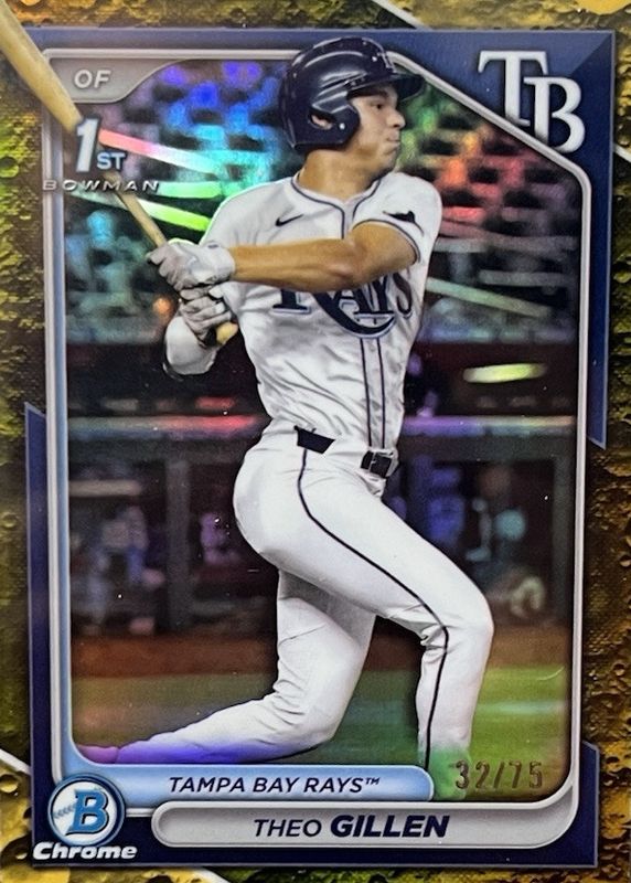 The Theo Gillen 2024 Bowman Draft #BDC-73 Chrome - Yellow Lunar Crater Refractor /75 (1st) card in Raw condition has not changed in price in the last 30 days and was last sold for $19.13 .