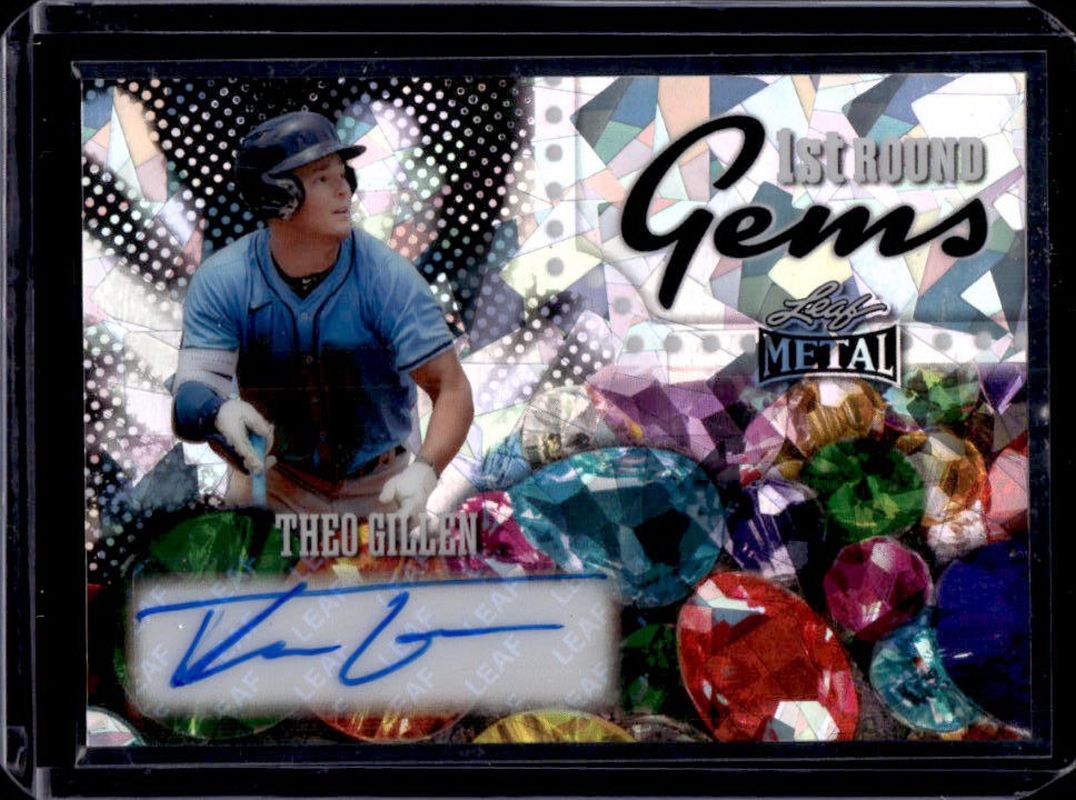 The Theo Gillen 2025 Leaf Metal #RG-TG1 1st Round Gems Autographs - Crystal Silver /25 card is 1 of 140 Theo Gillen's card variations in the 2025 Leaf Metal set being tracked by Sports Card Investor, including Base Set - Lite Brite Silver /99, 1st Round Gems Autographs - Lite Brite Silver /49, Base Autographs - Lite Brite Silver /49, Base Set - Prismatic Blue /49, and Next In Line - Lite Brite Silver /49.