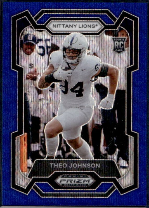 The Theo Johnson 2024 Prizm Draft Picks #150 Blue Wave /249 Rookie card is 1 of 33 Theo Johnson's card variations in the 2024 Prizm Draft Picks set being tracked by Sports Card Investor, including Base, Green, Purple Wave, Red Ice, and Ruby Wave.