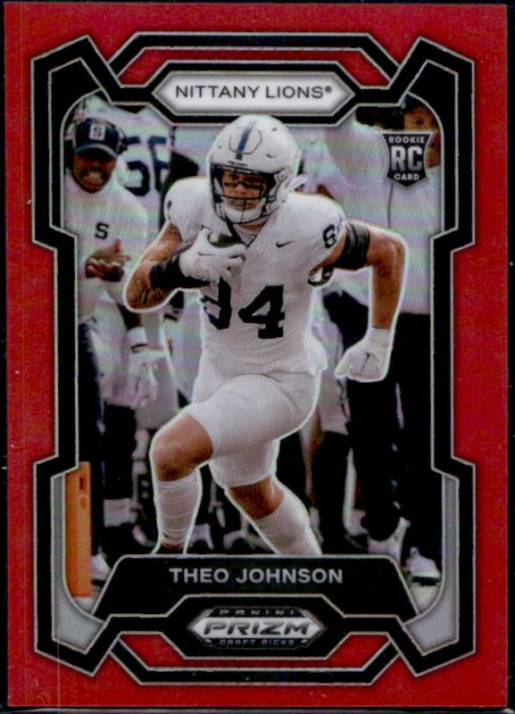 The Theo Johnson 2024 Prizm Draft Picks #150 Red /299 Rookie card is 1 of 33 Theo Johnson's card variations in the 2024 Prizm Draft Picks set being tracked by Sports Card Investor, including Base, Green, Purple Wave, Red Ice, and Ruby Wave.