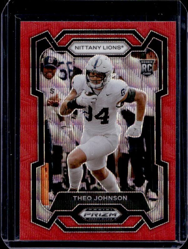 The Theo Johnson 2024 Prizm Draft Picks #150 Ruby Wave Rookie card is 1 of 33 Theo Johnson's card variations in the 2024 Prizm Draft Picks set being tracked by Sports Card Investor, including Base, Green, Purple Wave, Red Ice, and Silver.