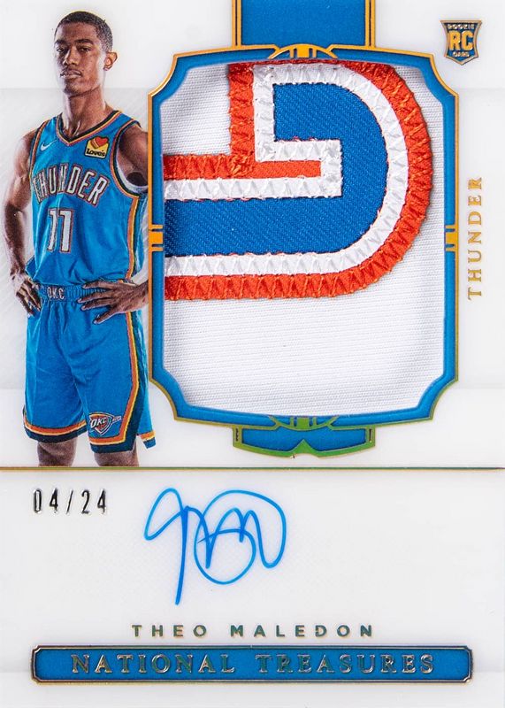 This card is 1 of 9 Theo Maledon's card variations in the 2020 National Treasures set being tracked by Sports Card Investor, including Rookie Patch Auto /99, Rookie Patch Auto - Gold /10, Rookie Patch Auto - Purple FOTL /8, Rookie Patch Auto - Emerald /5, and Rookie Patch Auto - Blue FOTL /3.