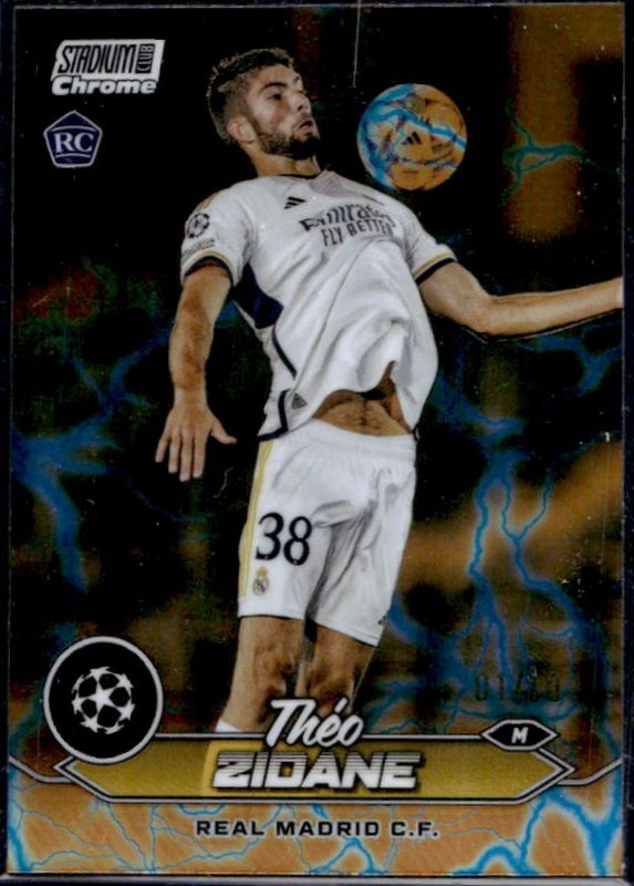 The Theo Zidane 2023 Topps Stadium Club Chrome UEFA Champions League #38 Orange Blue Electric Charge /10 Rookie card is 1 of 37 Theo Zidane's card variations in the 2023 Topps Stadium Club Chrome UEFA Champions League set being tracked by Sports Card Investor, including Base, Members Only Refractor, Pink Red Electric Charge Refractor, Refractor, and Black & White Refractor /299.