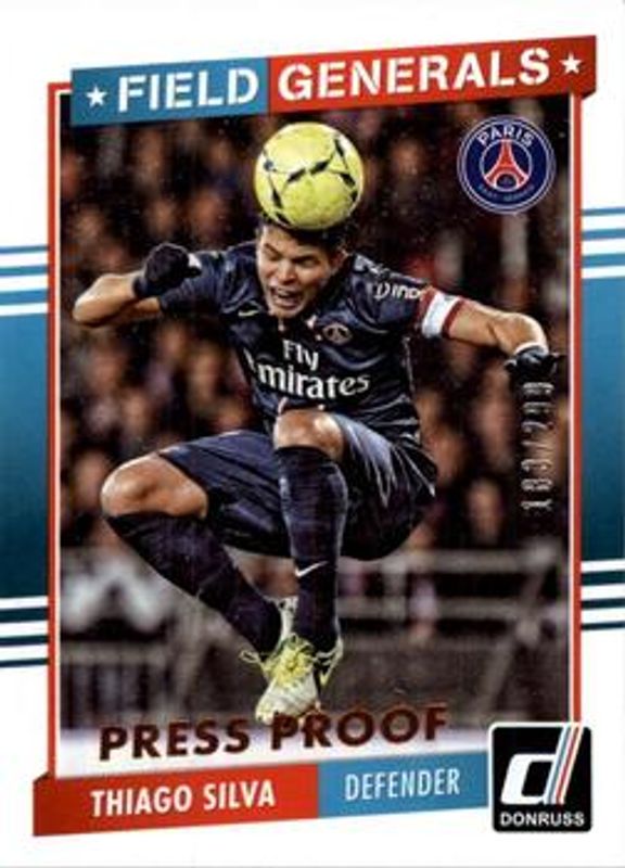 The Thiago Silva 2015 Donruss #14 Field Generals Bronze Press Proof /299 card is 1 of 32 Thiago Silva's card variations in the 2015 Donruss set being tracked by Sports Card Investor, including #54 Base, #54b Base, #54 Bronze Press Proof /299, #54b Bronze Press Proof /299, and #54b Silver Press Proof /199.