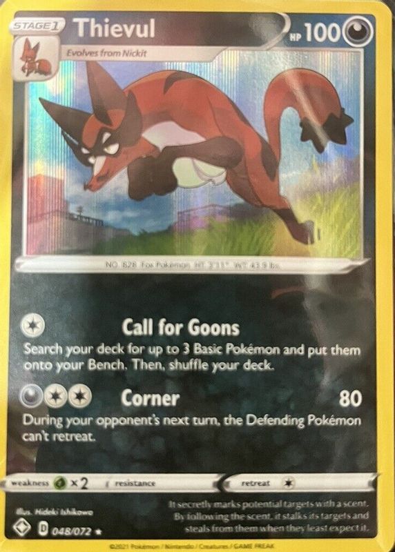 The Thievul 2021 Sword & Shield: Shining Fates #048/072 Holo card in Raw TCG (Near Mint) condition has not changed in price in the last 30 days and was last sold for $1.34 .