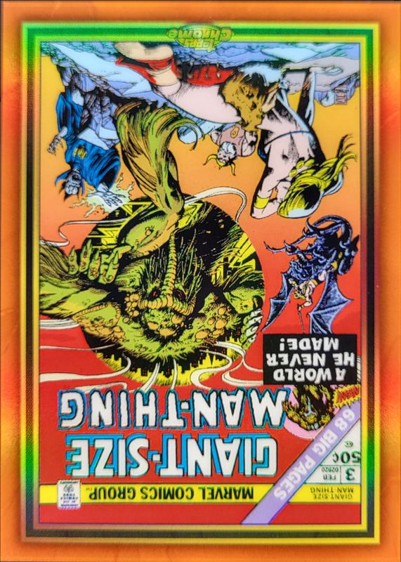 The Thing 2024 Topps Chrome #MG-6 Marvel Giant Sized 50th Anniversary - Orange Refractor /25 card is 1 of 15 Thing's card variations in the 2024 Topps Chrome set being tracked by Sports Card Investor, including Marvel Giant Size 50th Anniversary Oversized Box Topper, Marvel Giant Sized 50th Anniversary, Marvel Giant Size 50th Anniversary Oversized Box Topper - Gold Refractor /50, Marvel Giant Sized 50th Anniversary - Gold Refractor /50, and Marvel Giant Size 50th Anniversary Oversized Box Topper - Orange Refractor /25.
