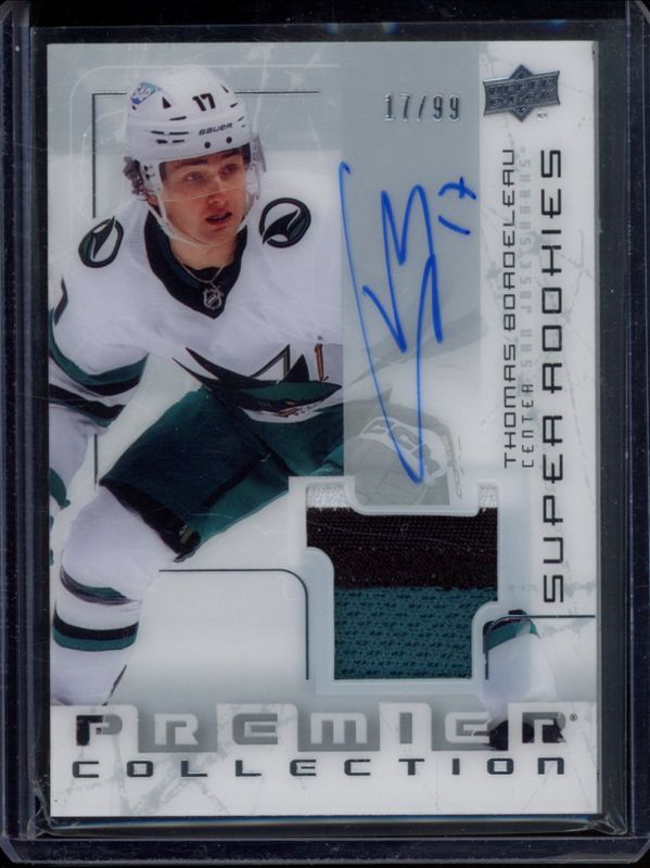 The Thomas Bordeleau 2022 Upper Deck Premier #SRR-TB 2003 Rookie - Auto Patch /99 card is 1 of 36 Thomas Bordeleau's card variations in the 2022 Upper Deck Premier set being tracked by Sports Card Investor, including Base /399, Autographs, Jersey, Rookies Bronze /199, and Gold /65.