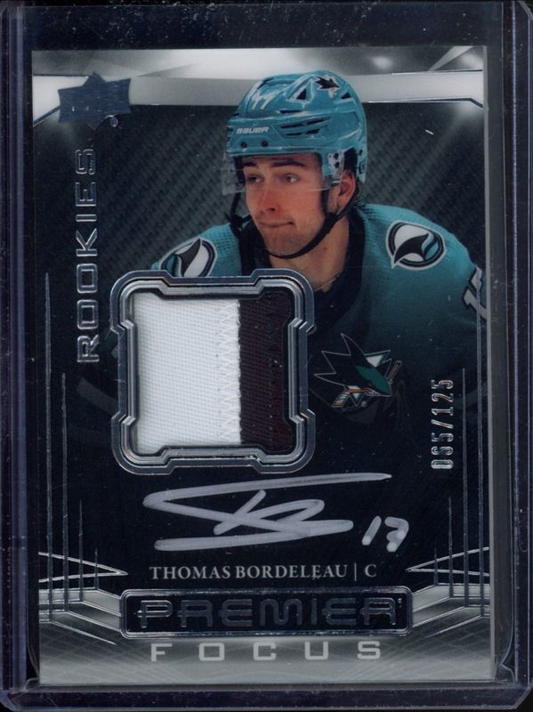 The Thomas Bordeleau 2022 Upper Deck Premier #PFPR-TB Premier Focus Rookies - Auto Patch /125 card is 1 of 36 Thomas Bordeleau's card variations in the 2022 Upper Deck Premier set being tracked by Sports Card Investor, including Base /399, Autographs, Jersey, Rookies Bronze /199, and Gold /65.