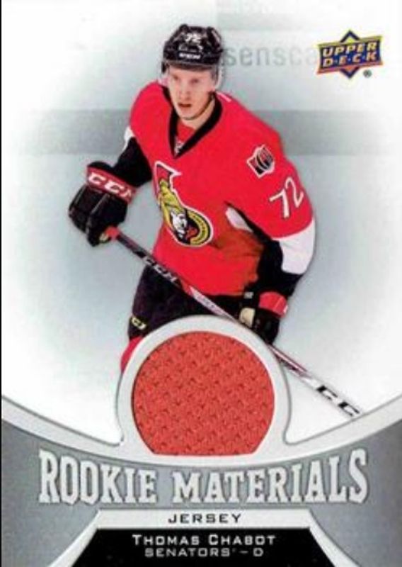 The Thomas Chabot 2016 Upper Deck #RM-TC Rookie Materials card is 1 of 27 Thomas Chabot's card variations in the 2016 Upper Deck set being tracked by Sports Card Investor, including Young Guns Base, Young Guns Canvas, Young Guns - Clear Cut, Young Guns - Gold Rainbow Foil, and Young Guns - Jumbo.