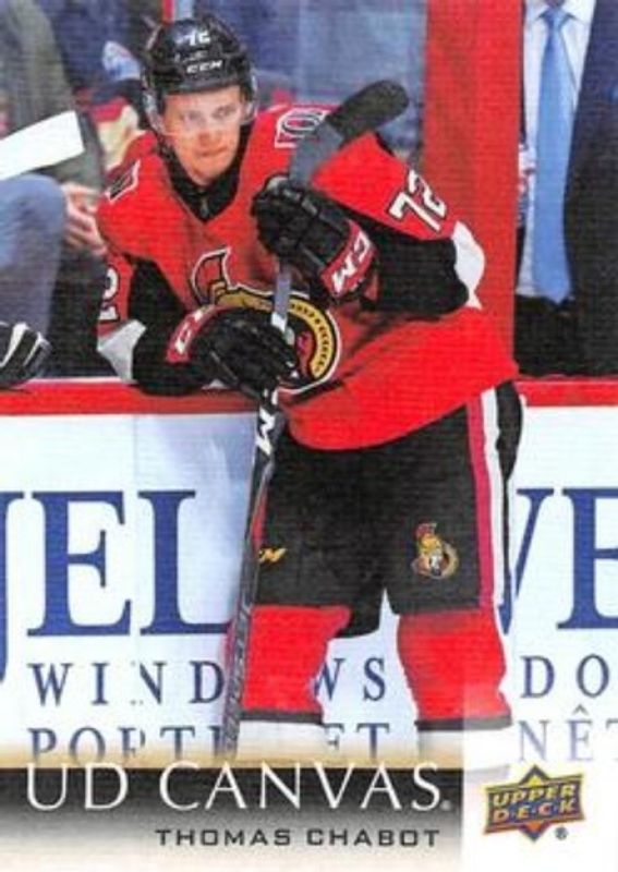 The Thomas Chabot 2018 Upper Deck #C59 UD Canvas card is 1 of 8 Thomas Chabot's card variations in the 2018 Upper Deck set being tracked by Sports Card Investor, including Base, Clear Cut, Silver Foil, Speckled Rainbow Foil, and UD Exclusives /100.