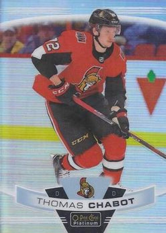 The Thomas Chabot 2019 O-Pee-Chee Platinum #142 Rainbow card is 1 of 13 Thomas Chabot's card variations in the 2019 O-Pee-Chee Platinum set being tracked by Sports Card Investor, including #142b Base, #142 Base, #142 Matte Pink, #142 Sunset, and #142 Violet Pixels /399.